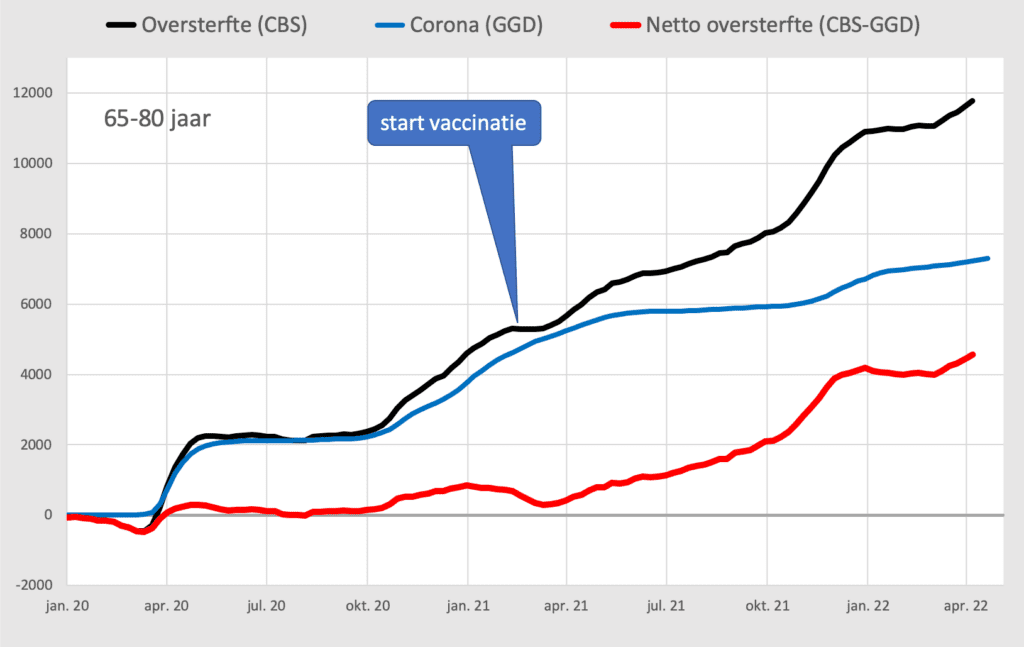 We zien in deze grafiek voor de leeftijdsgroep 65-80 jaar, dat sinds maart de oversterfte weer aan het toenemen is met dezelfde snelheid als eind 2021, terwijl het aantal overlijdens aan corona inmiddels is gedaald tot een tiental per dag. Het verschil tussen oversterfte en overlijdens aan corona is de rode lijn, de niet door corona verklaarde oversterfte.