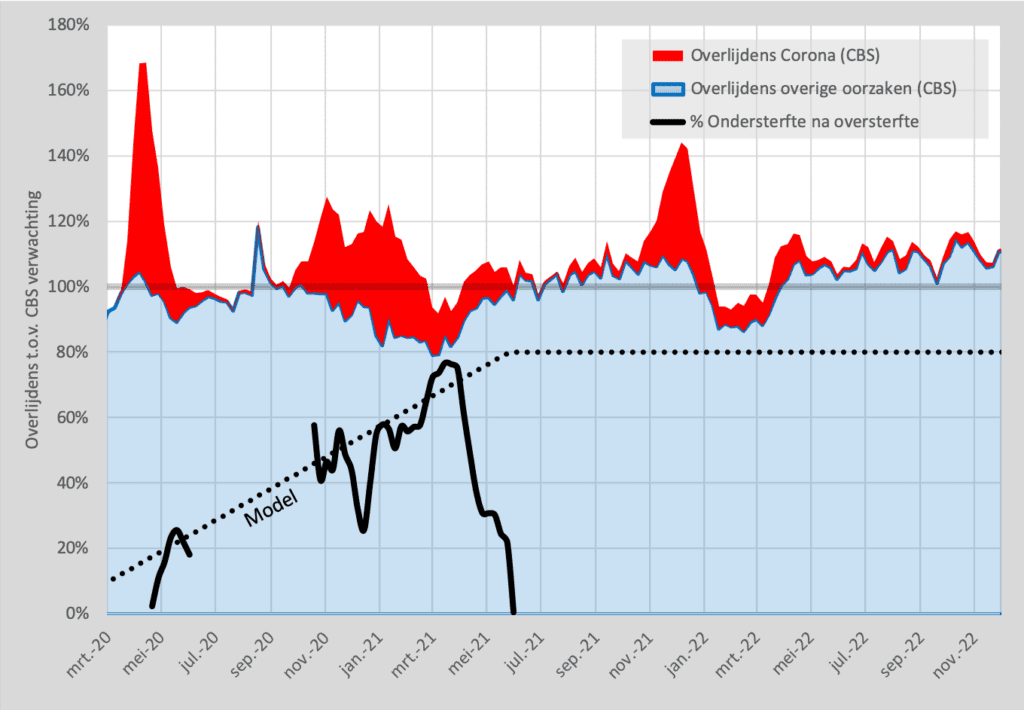 Tot eind 2023 worden er door het model 33.000 “onverklaarde” overlijdens voorspeld. Het loopt ook zeer gelijk op met de werkelijke cijfers. Ook is zo heel goed te zien dat deze oversterfte begint af te wijken van de corona overlijdens, zodra de vaccinaties echt van start gaan. Wat de langere termijn cijfers gaan doen is nog onzeker. Er zijn op zich geen redenen om aan te nemen dat de lijn steiler of juist vlakker zal gaan lopen, dat zullen we af moeten gaan wachten.