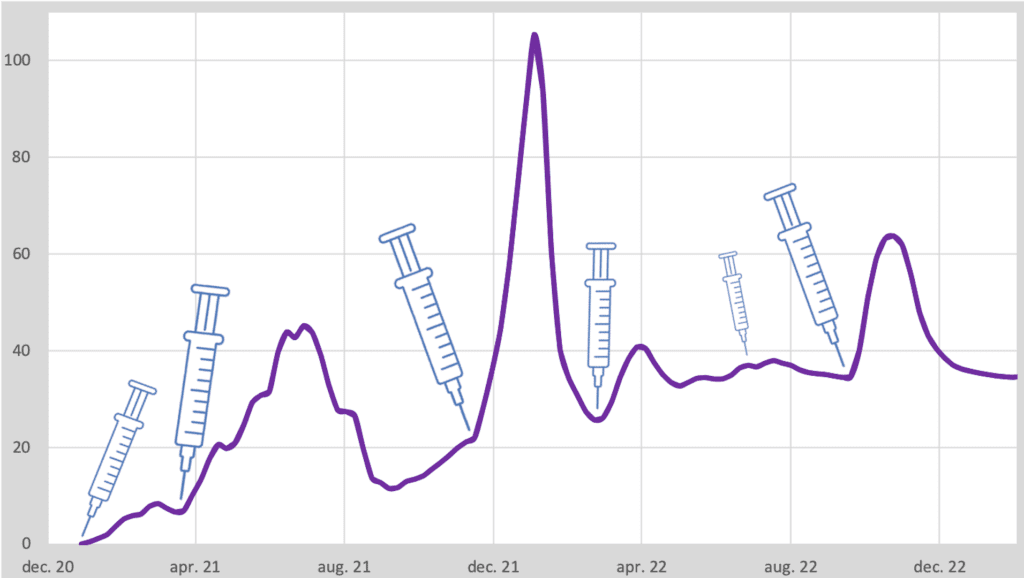 De overlijdenskans die het model voorspelt, is nu 0,08% per prik voor de basisserie en 0,09% voor de booster en herhaalprikken. Oftewel 0,4% voor iemand die 5 prikken heeft gehad, een kans van 1 op 250 dus. Deze kans is gelijk verdeeld over de eerste twee weken en de periode vanaf rond de 20 weken na vaccinatie. Hoe lang dit zal voortzetten is nog onduidelijk, maar het lijkt tenminste 18 maanden te zijn. Wij gingen uit van 24 maanden.