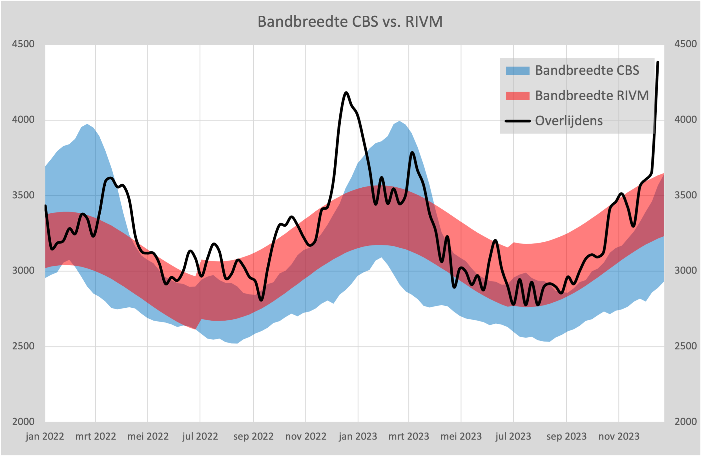 Het CBS ging tot 2020 uit van een aantal overlijdens per week, gemiddeld over de 5 voorgaande jaren. In de wintermaanden zitten daar dan dus jaren bij met een (flinke) griep en jaren waarin er nauwelijks griep was, dus een lagere sterfte. Het gemiddelde is de “baseline” en de variaties daaromheen de “bandbreedte”. Via een rekenprocedure wordt de breedte vastgesteld en die is dus in de winter veel groter dan in de zomer.