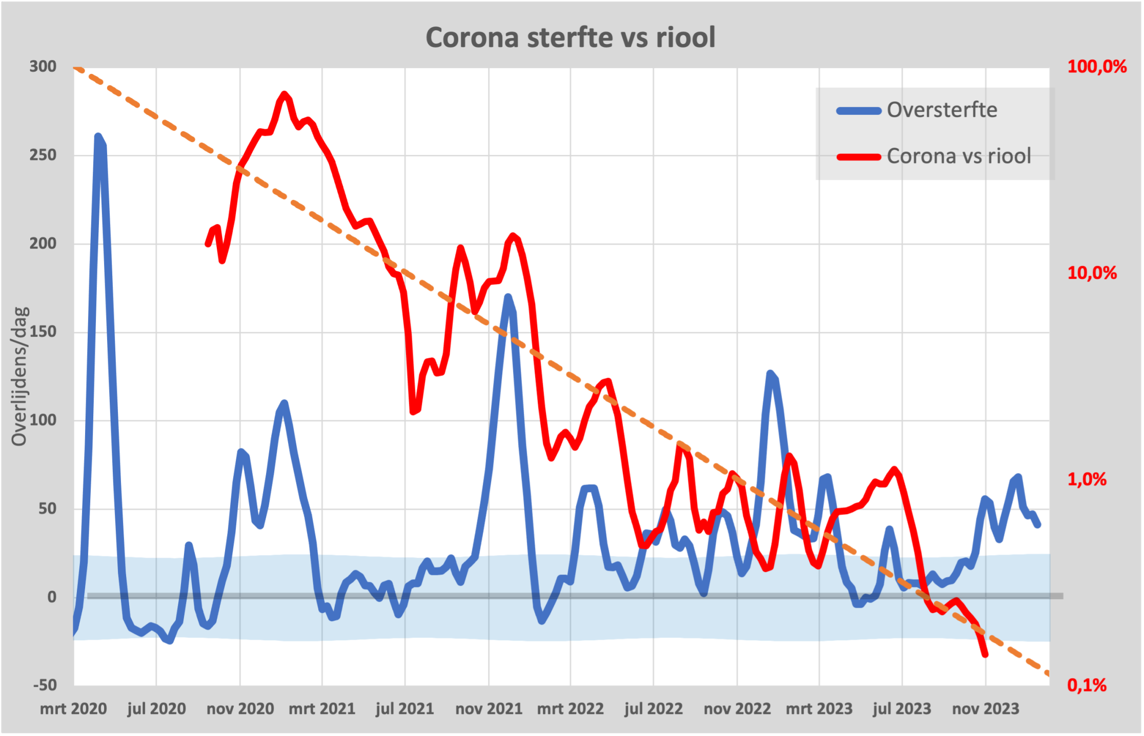 We zien hier op een logaritmische schaal in rood het percentage overlijdens aan corona in verhouding tot het aantal virusdeeltjes in het riool (Willy Spaan zegt: “het gaat nu pas beginnen”). We zien hier dat sinds de rioolwatermetingen begonnen, de sterfte in vergelijking met de hoeveelheid virus in het riool een factor 1000 is afgenomen.