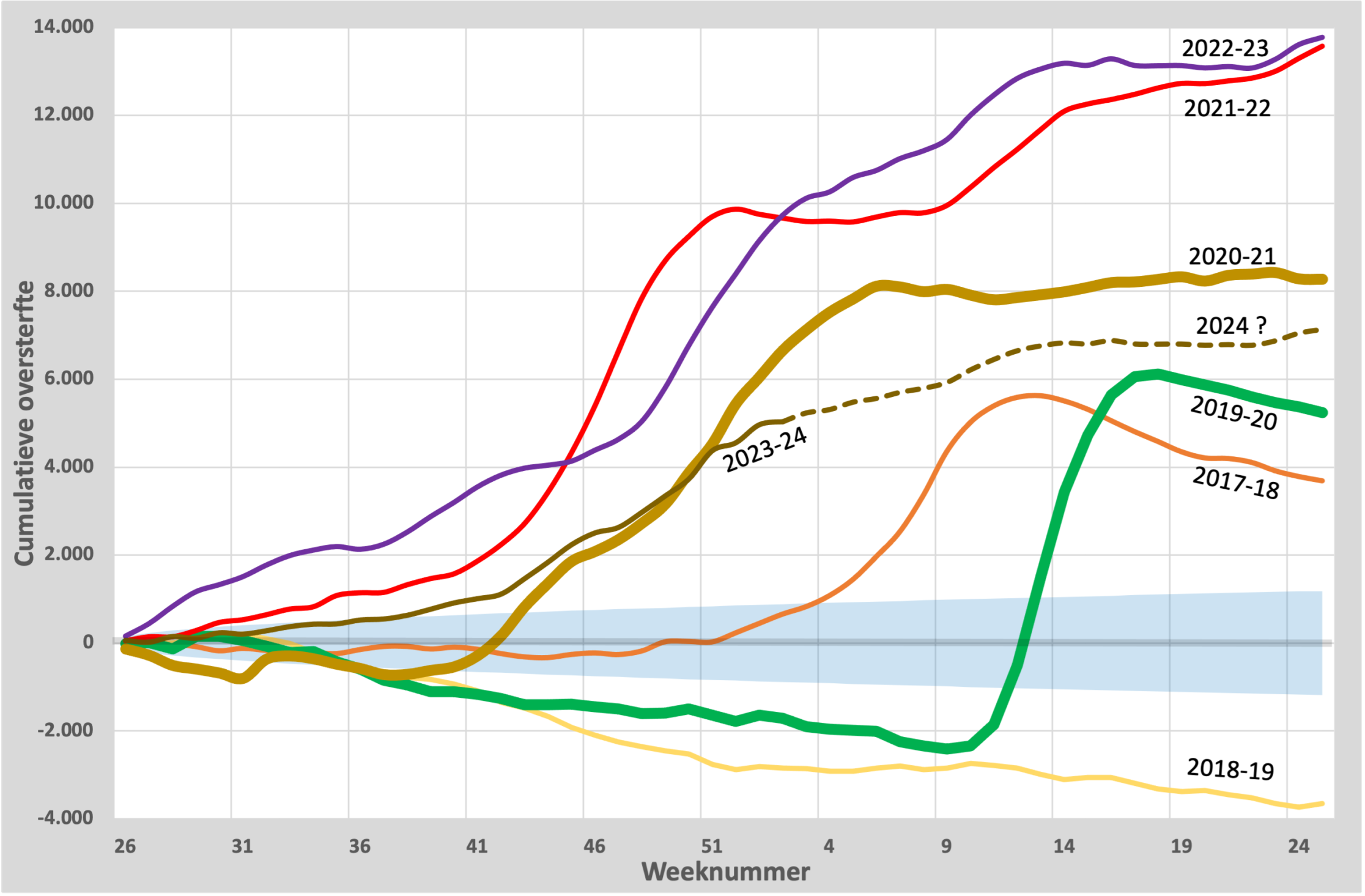 Voor het seizoen 2023/2024 (donkerbruin) zijn we inmiddels halverwege en we lijken een halvering van de oversterfte te zien in vergelijking tot 2022/2023. De bruine streeplijn is de prognose voor de rest van het seizoen, dus tot komende zomer. We lijken dan uit te komen op een totale oversterfte rond de 7000 voor het hele seizoen 2023/2024, maar er kunnen natuurlijk nog onverwachte verrassingen op ons afkomen.