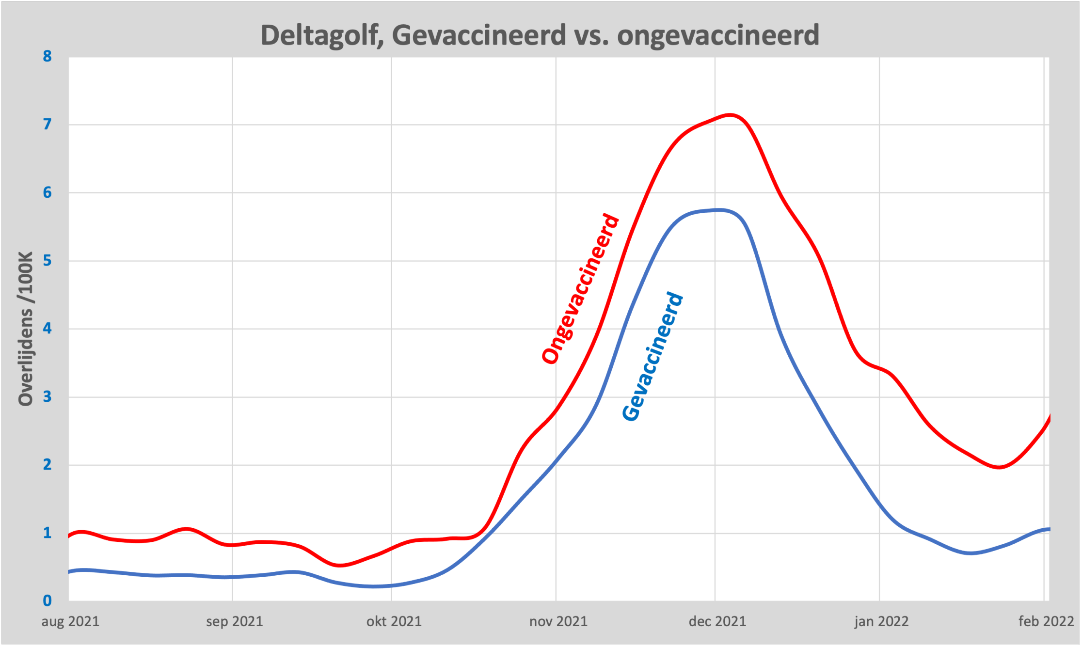 De blauwe lijn is de sterfte van gevaccineerden aan covid-19 per 100.000 inwoners. De rode lijn voor ongevaccineerden. Nu zien we dat de sterfte onder gevaccineerden maar iets lager was dan die onder ongevaccineerden. Vaccineren heeft slechts 20% van de overlijdens aan covid-19 voorkomen, waar ons toch echt 95% beloofd was. Precies op het moment dat we de bescherming nodig hadden, was deze vrijwel verdwenen, dat is gek.