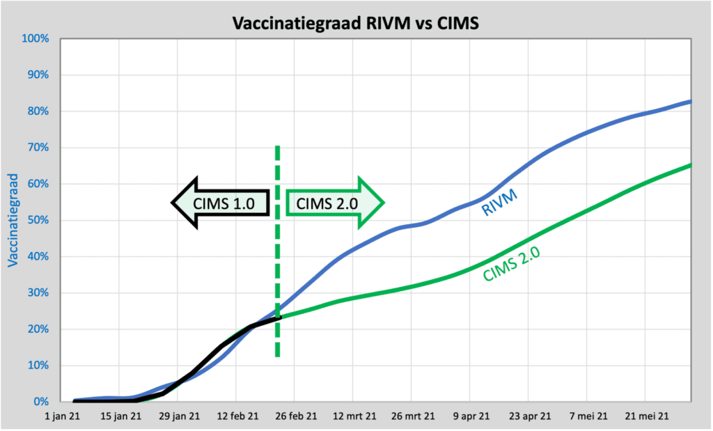 Op 4 maart 2021 wordt melding gemaakt van het in productie nemen van een nieuwe versie van CIMS, versie 2.0. Dat zou op zich geen groot nieuws hoeven te zijn, maar het heeft er alle schijn van dat toen pas de beperking ingebouwd was dat overledenen niet geregistreerd mochten worden. We zien namelijk dat vanaf die datum de zwarte en blauwe lijn plotseling uit elkaar gingen lopen: