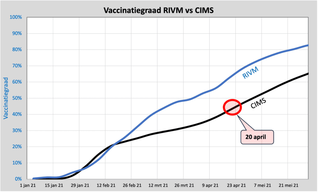 Het is te toevallig om het niet aan de nieuwe versie toe te kunnen schrijven. Maar we gaan verder met de reconstructie. Op 20 april 2021 schrijft het RIVM een memo waarin het zich zorgen maakt over de oplopende achterstand in de registraties van de vaccinaties in CIMS. Er zou volgens het RIVM op die datum een achterstand zijn van 29,7% van het tot dan toe aantal gezette prikken. Zeer opmerkelijk en dat heeft uiteraard de krant niet gehaald. Maar die 29,7% kunnen we nu natuurlijk wel opnemen in deze grafiek en zien of die overeenkomt met onze eigen berekeningen vanuit de CBS-cijfers: