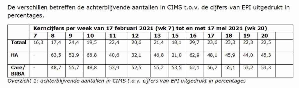 - Een memo van RIVM op 20 april 2021 waarin RIVM haar zorgen uit over een achterstand van 29,7% bij het registreren in CIMS. (deze pagina is inmiddels verwijderd door het RIVM. Download hem hier nu).