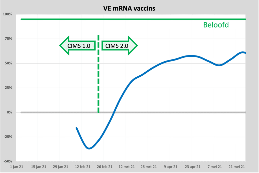 We zien overigens dat de door ons berekende VE pas positief werd in maart 2021, daarvoor was deze negatief. We hebben dat al beschreven in april van dit jaar. Maar als we inzoomen op de eerste maanden, dan zien we dat het positief worden van de veronderstelde bescherming, vrijwel samenvalt met het in gebruik nemen van de nieuwe CIMS-versie.