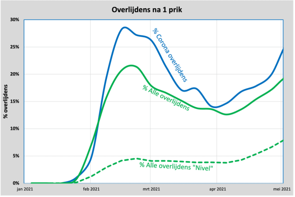 De laatste aanwijzing komt uit de recente publicatie van het Nivel, waarin zij concludeert dat de oversterfte zit bij ongevaccineerden en ondersterfte juist bij gevaccineerden. Dat zou dus inhouden dat we de 10% oversterfte die we zien, moeten verdelen onder de 10% ongevaccineerden (even afgeronde cijfers gebruikt), wat dan inhoudt dat ongevaccineerden vanaf het begin van vaccinatie opeens tweemaal zo vaak sterven, als we ervan uitgaan dat gevaccineerden precies evenveel kans hebben om te overlijden. Nivel stelde zelfs dat gevaccineerden 20% minder vaak zouden sterven, dus ook die 20% moeten we dan verdelen over de 10% ongevaccineerden. Ze zouden dus zelfs minstens viermaal zo vaak sterven sinds 2021.
