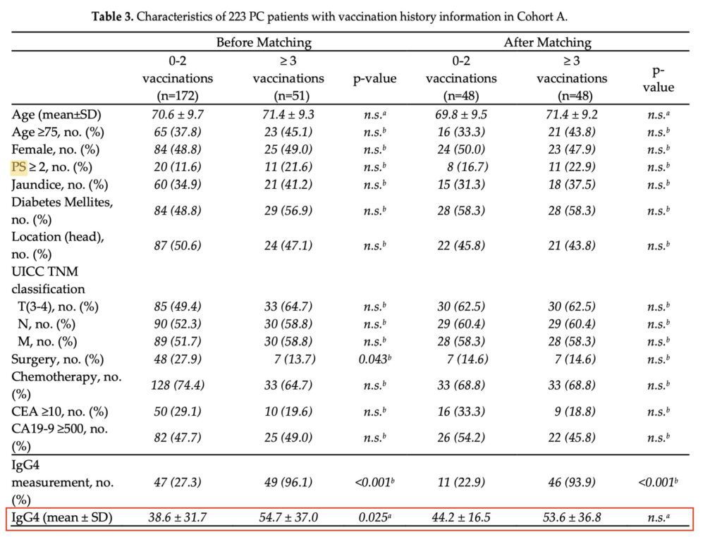 Duidelijk te zien is dat de groep met 3 of meer vaccinaties er qua prognostische factoren veel slechter voorstaat, onder andere wat betreft de tumorstadia en operatiestatus (zie de rode box). Maar we weten inmiddels dat dit zeer waarschijnlijk niet door ‘uitgestelde zorg’ veroorzaakt wordt. Verder is te zien, dat de gemiddelde concentratie van IgG4 in het bloed in de tweede groep nu statistisch wel significant hoger is dan in de eerste groep. Dat is echter slechts een statistisch gegeven, waarin ik niet veel waarde hecht.