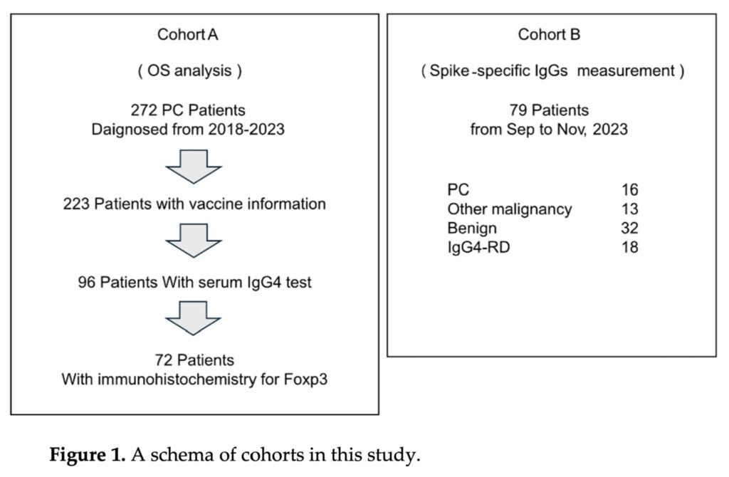 Dan de studie zelf. Die is qua opzet niet moeilijk. Er zijn twee cohorten. Het eerste is een cohort van 272 patiënten uit de periode januari 2018 tot november 2023. Van 223 van deze patiënten was de vaccinatiestatus bekend en bij 96 werden IgG4 spiegels bepaald. Verder was er van 72 patiënten pathologisch weefsel beschikbaar om gekleurd te worden op een bepaalde marker, het eiwit Foxp3, waarmee het aantal regulatoire T-cellen bepaald kan worden. Dat laat ik verder buiten beschouwing omdat het voor dit verhaal minder belangrijk is, het zegt alleen iets over de pathofysiologie.