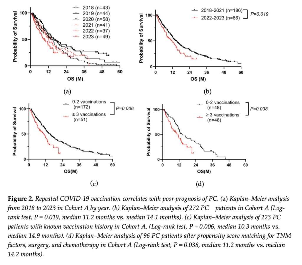 - Dit gaat over de snelheid van progressie van kanker. Het gaat dus om mensen die al kanker hebben. Daarbij zit er echter een grote dikke adder onder het gras. Want er is altijd een zeker percentage mensen dat al kanker onder de leden heeft, maar dat nog niet weet: het is simpelweg nog niet gediagnosticeerd en het heeft blijkbaar nog niet in die mate tot klachten of symptomen geleid dat mensen daarmee naar de dokter zijn gegaan (patient’s delay), of – en dat komt ook regelmatig voor – de dokter herkent die klachten en symptomen niet als behorende bij kanker: “Doctor’s delay.” Dit kan er toe leiden dat mensen zich kort na vaccinatie presenteren met uitgebreide uitzaaiingen van een bepaalde tumor – het verhaal van prof. Dalgleish – of dat bij mensen die in de komende weken tot maanden sowieso manifest kanker ontwikkeld zouden hebben, een tumor zich eerder manifesteert door de vaccinatie met een mRNA-vaccin. Dan lijkt het of het mRNA-vaccin dit veroorzaakt heeft, terwijl het ‘slechts’ het manifest worden van de tumor heeft versneld, ofwel, slechts zichtbaar heeft gemaakt wat onherroepelijk toch stond te gebeuren. Ook dat acht ik een aannemelijk scenario. Als dit het effect van IgG4 is, zie je dat zeer waarschijnlijk niet terug in de cijfers over de kankerincidentie, alleen in de getallen over de prognose. Dat is belangrijk om in het achterhoofd te houden, want daarmee kom ik als vanzelfsprekend bij de bovengenoemde studie uit. Want dat is precies wat deze studie laat zien: een verandering van de prognose. Dat zal ik hieronder bespreken.