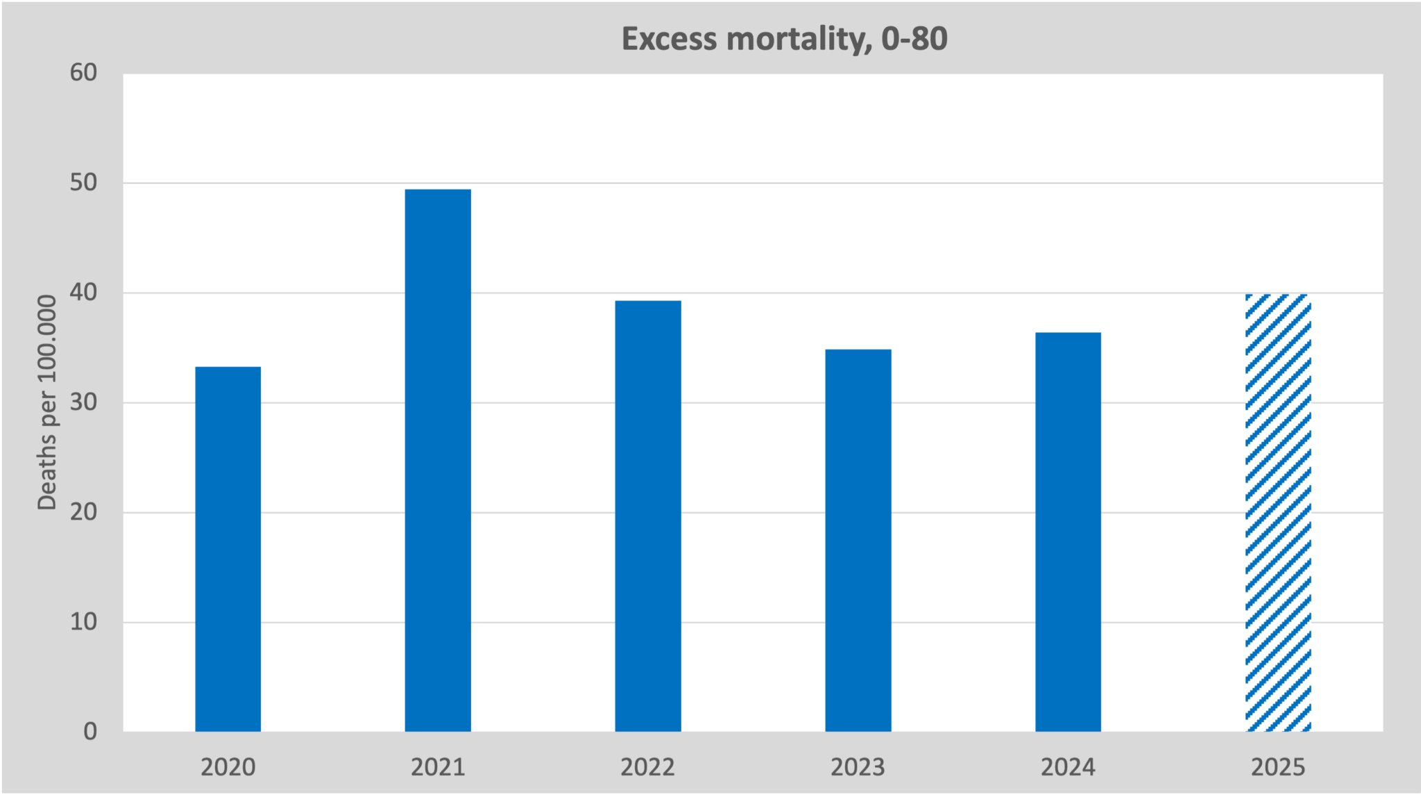 Mortality 0-80Het beeld onder de 80 jaar is heel anders. Daar is de oversterfte in het eerste corona-jaar lager dan alle daaropvolgende jaren. In 2021 was de oversterfte zelfs 50% hoger. Voorlopige cijfers laten zien dat de oversterfte dit jaar weer iets hoger gaat worden dan in 2024, maar dat is nog onzeker.
