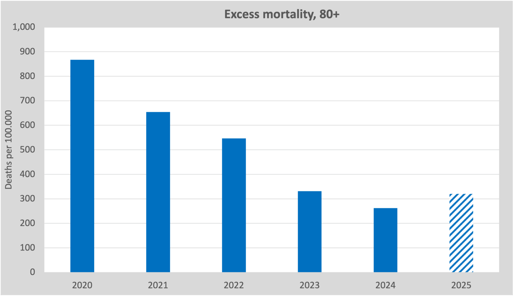 Vanaf 2022 was er vrijwel geen corona meer, maar desondanks daalden de cijfers maar langzaam. De laatste staaf is de voorlopige schatting voor 2025 op basis van de cijfers voor het eerste half jaar in vergelijking tot het eerste halfjaar van 2024. De oversterfte lijkt dus weer toe te nemen, maar we moeten bedenken dat de griepgolf van dit seizoen enkele maanden eerder dan gebruikelijk kwam.