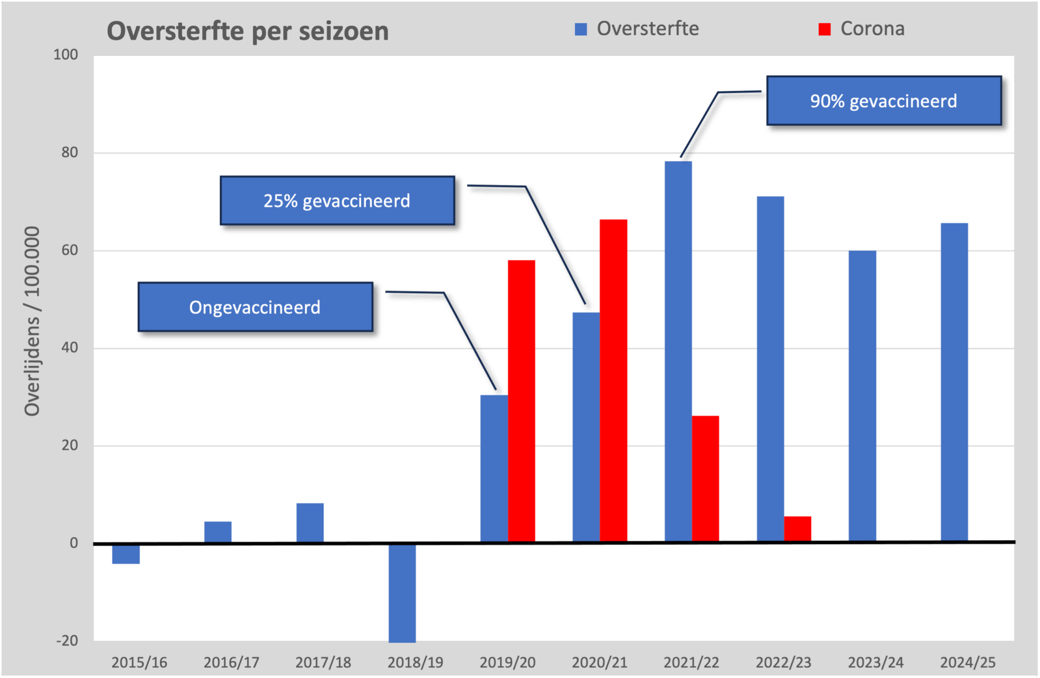 In het seizoen 2021/22 zien we een heel ander beeld. De sterfte aan corona was meer dan gehalveerd, terwijl de oversterfte bijna verdubbelde, ondanks de beschermende vaccinaties. Dat beeld zet zich voort in de daaropvolgende jaren: steeds minder corona en inmiddels weer stijgende oversterfte.
