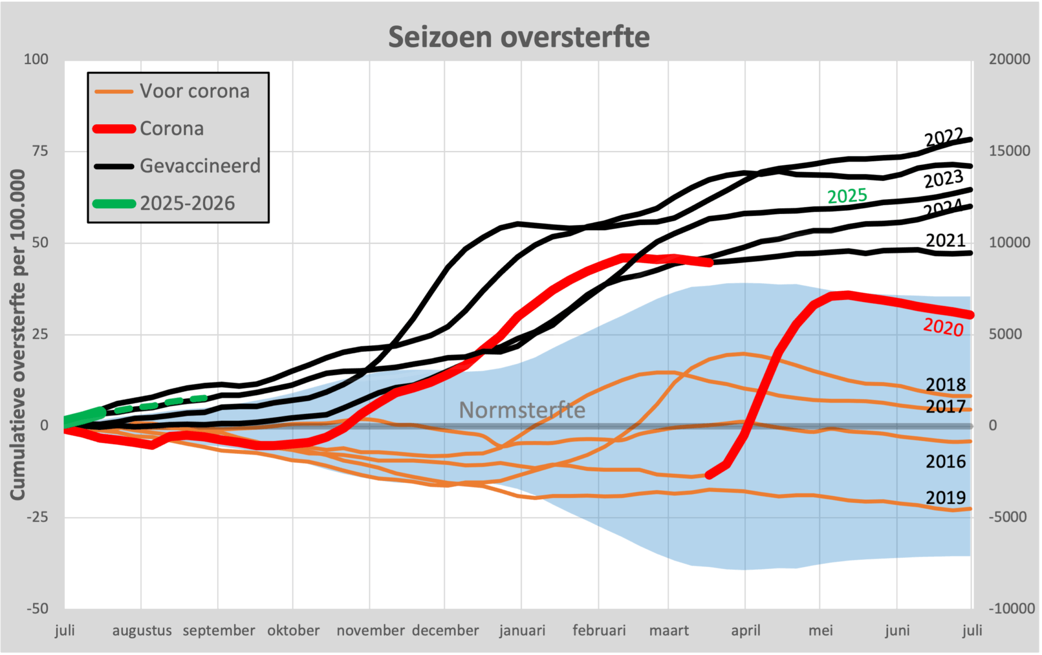 We zien ook dat de opgebouwde oversterfte medio maart 2021 (het einde van de rode corona lijn) weer terug lijkt af te buigen richting de blauwe bandbreedte, maar “iets” zorgde ervoor dat de afbuiging naar beneden werd omgezet in een weer stijgende lijn; de bandbreedte raakte steeds verder uit beeld. Ook in de 4 daaropvolgende seizoenen blijft de oversterfte onverminderd hoog.