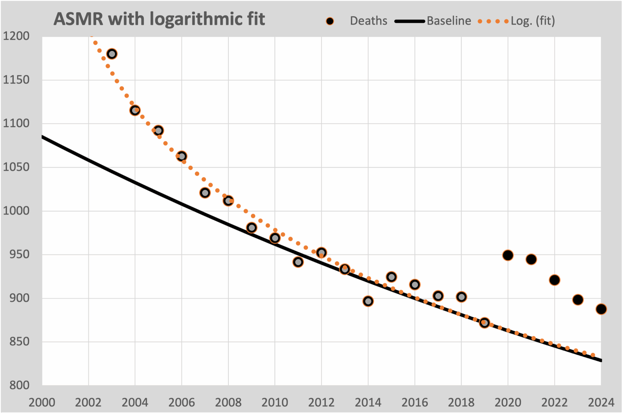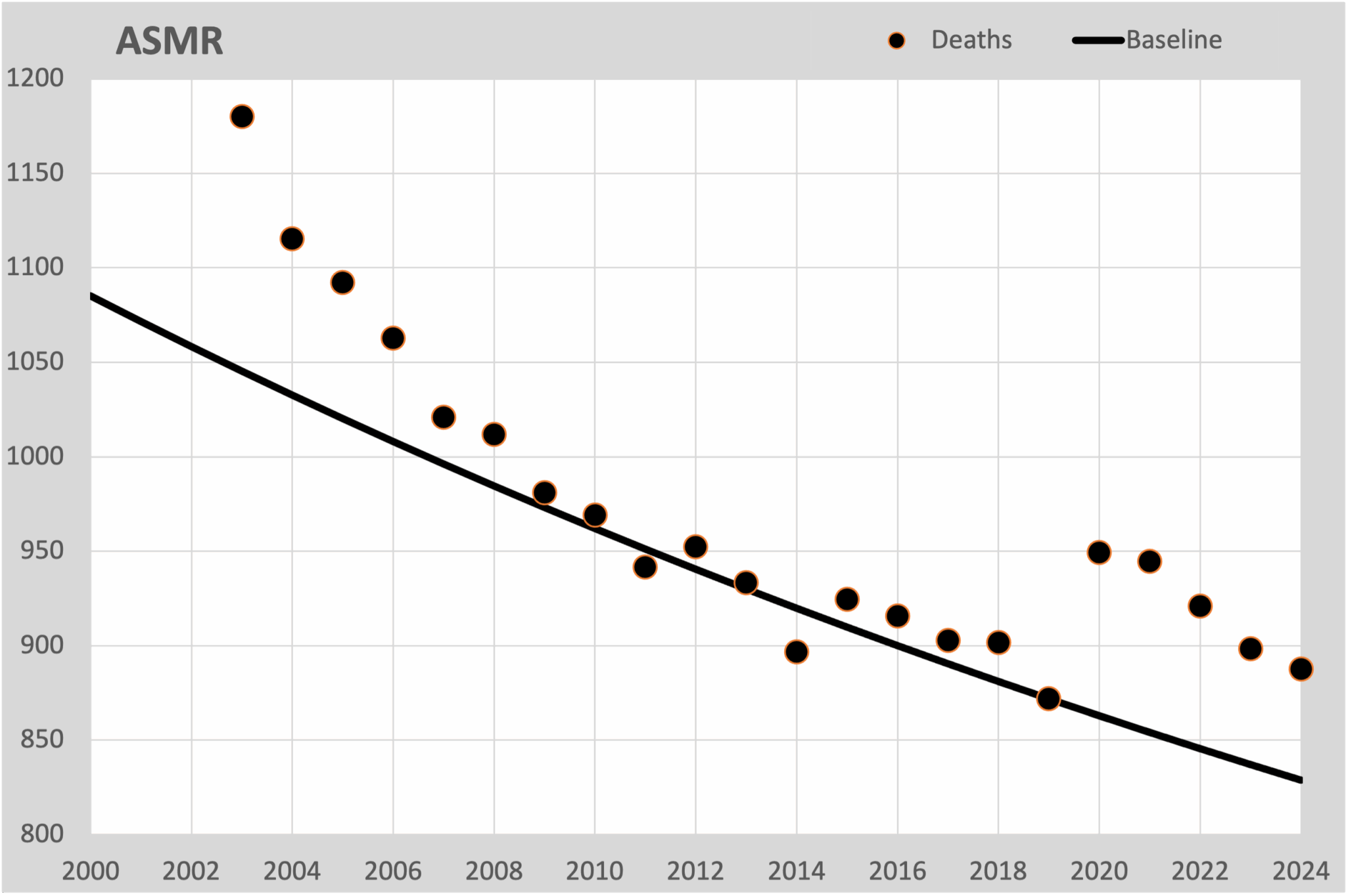 De ultieme manier om te corrigeren voor veranderingen in de bevolkingssamenstelling is de ASMR (Age Standardized Mortality Rate). Daarbij worden de sterftecijfers omgerekend naar een standaard bevolking. In ons geval kiezen we voor de bevolkingsopbouw van 2019, de laatste zonder invloed van de “grote onbekende”. Ook de baseline rekenen we op deze manier om naar de cijfers van 2019. Dit is de grafiek die daarbij hoort.