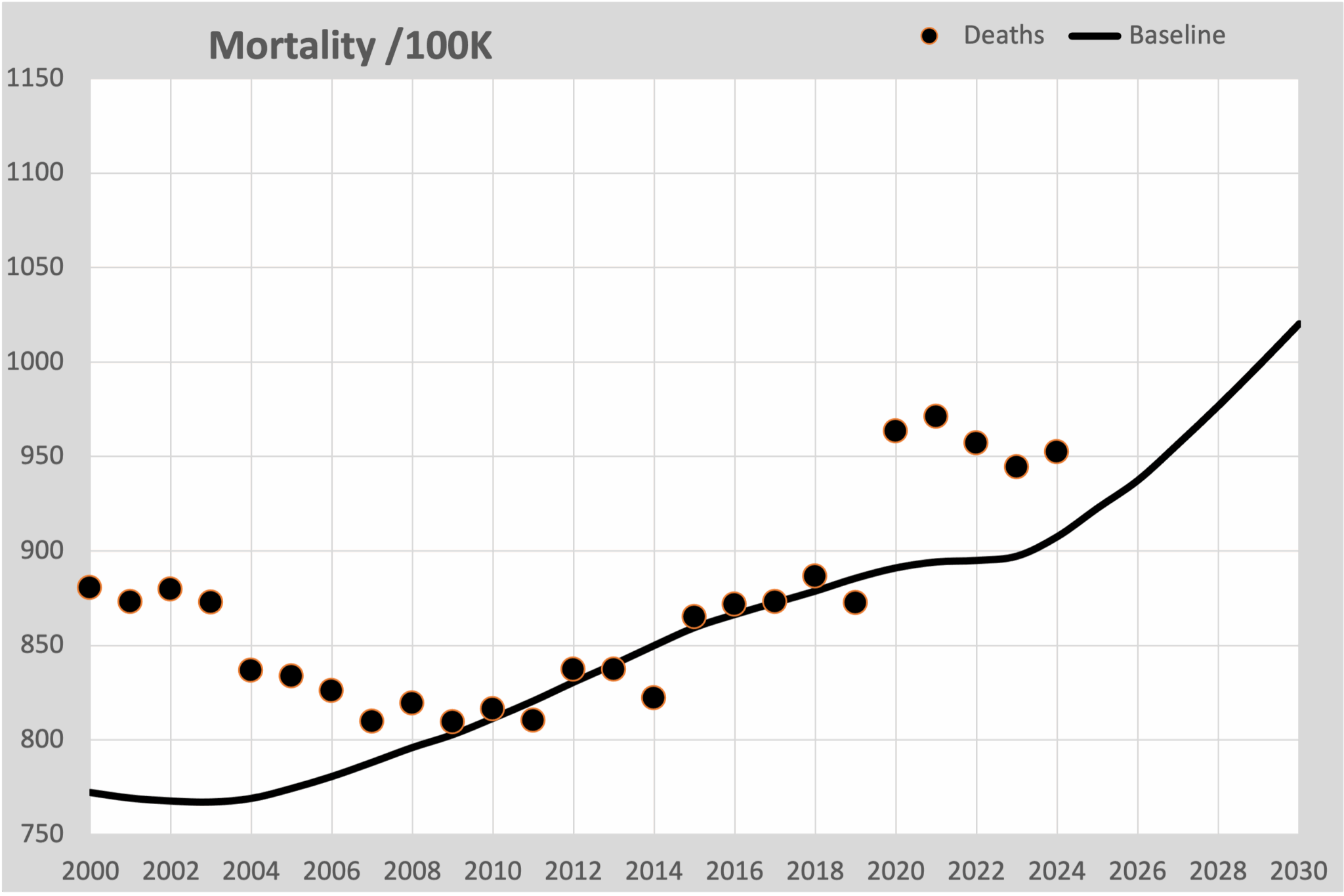 ASMRDit is als het ware de sterftekans als de bevolkingssamenstelling niet zou zijn veranderd, geen vergrijzing. Alhoewel we deze cijfers niet rechtstreeks kunnen vergelijken met de daadwerkelijke sterfte, geeft het wel een goed inzicht in de ontwikkeling van de sterfteverwachting. Net als bij de sterfteverwachting voor 50 jaar in de eerste grafiek ook hier dezelfde daling, berekend voor alle inwoners volgens de ASMR-methode. En het belangrijkste: hier zien we de oversterfte ontstaan vanaf 2020. Ontdaan van alle vergrijzingseffecten. Dus iedereen die vergrijzing noemt als oorzaak van de oversterfte, kan aan deze grafiek zien dat het niets met vergrijzing te maken heeft.