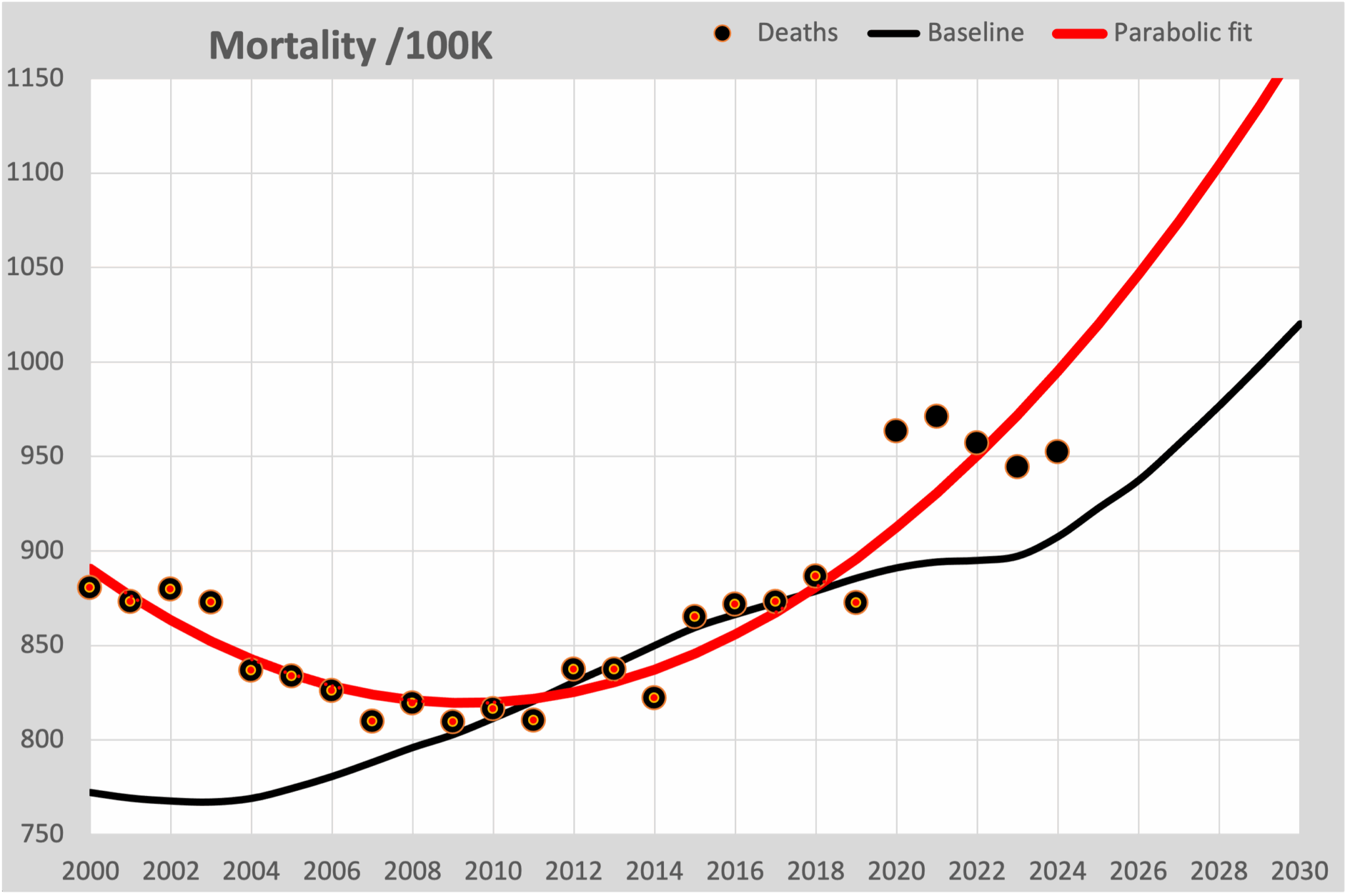 2. De dalende sterfte van 2000 tot 2010 laat hen verleiden te kiezen voor een parabolisch model, dat de cijfers ook vóór 2010 goed beschrijft. De consequentie is dat voor de toekomst dan juist een steeds sterker stijgende sterfte wordt voorspeld.