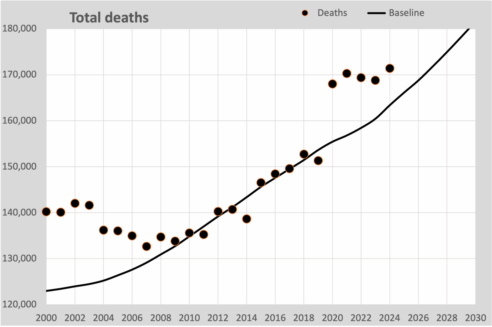 De getrokken lijn is weer dezelfde baseline als uit de vorige grafiek, wederom doorgetrokken tot 2030 met behulp van geschatte populaties na 2025.