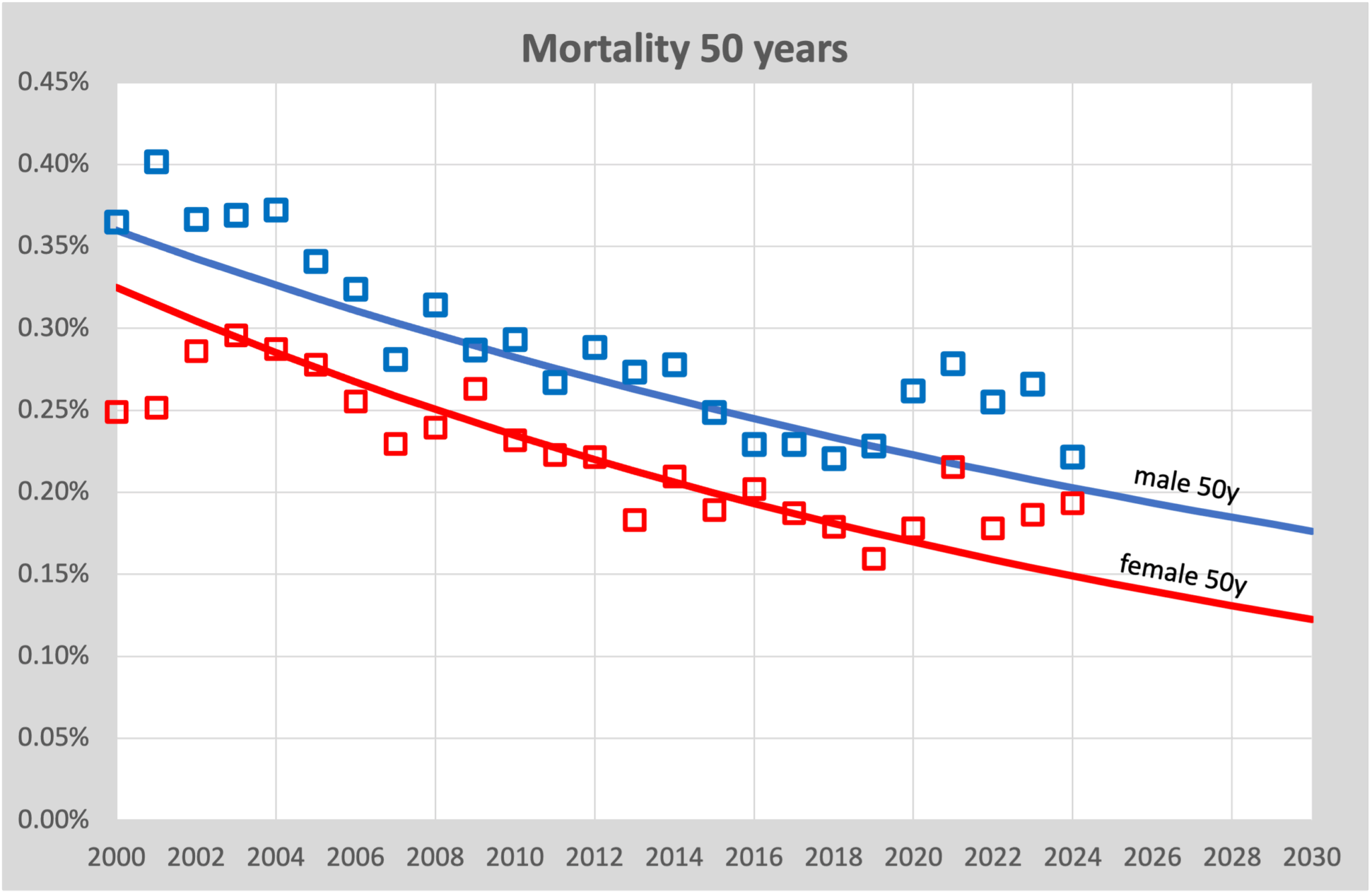 We moeten ons dus tegelijk realiseren dat deze grafiek een enkel leeftijdscohort is van alleen 50-jarigen. Vergrijzing van andere cohorten is dus niet van toepassing, dit gaat alleen over de overlijdenskans. Een tegendraadse trend want door vergrijzing stijgen de sterftecijfers van de bevolking als totaal, terwijl theoretisch elk 1-jaars cohort een dalende trend zou kunnen laten zien.