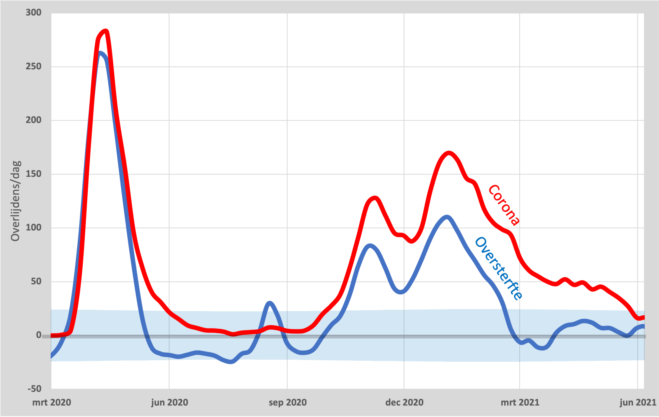 De grafiek met seizoenssterfte laat zien dat de oversterfte door de eerste golf wegvalt tegen de ondersterfte in het voorafgaande seizoen.Lees meer...