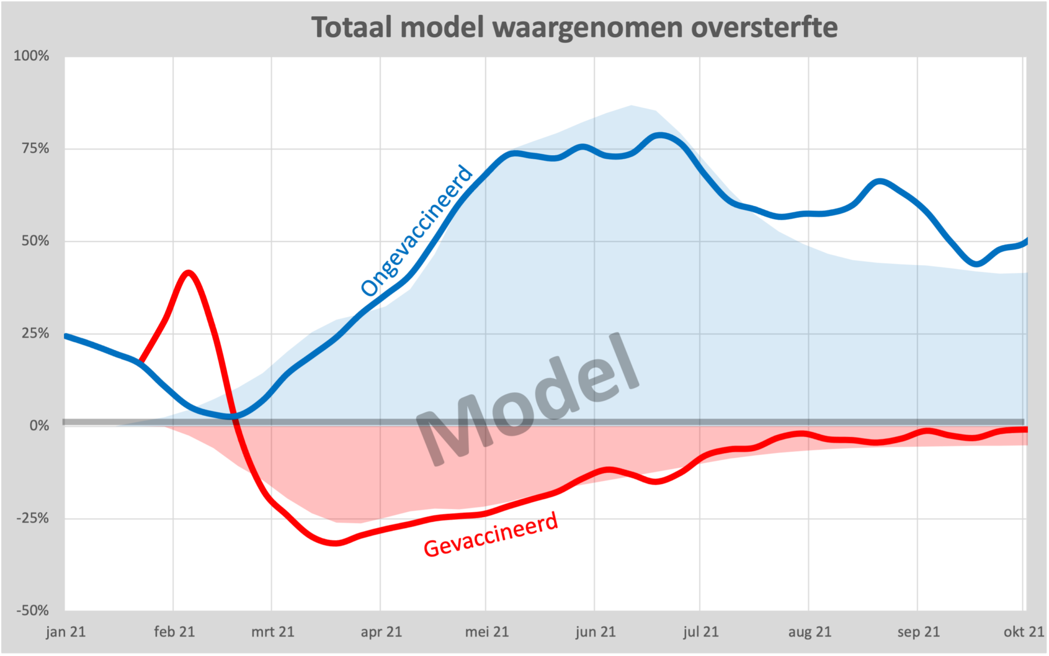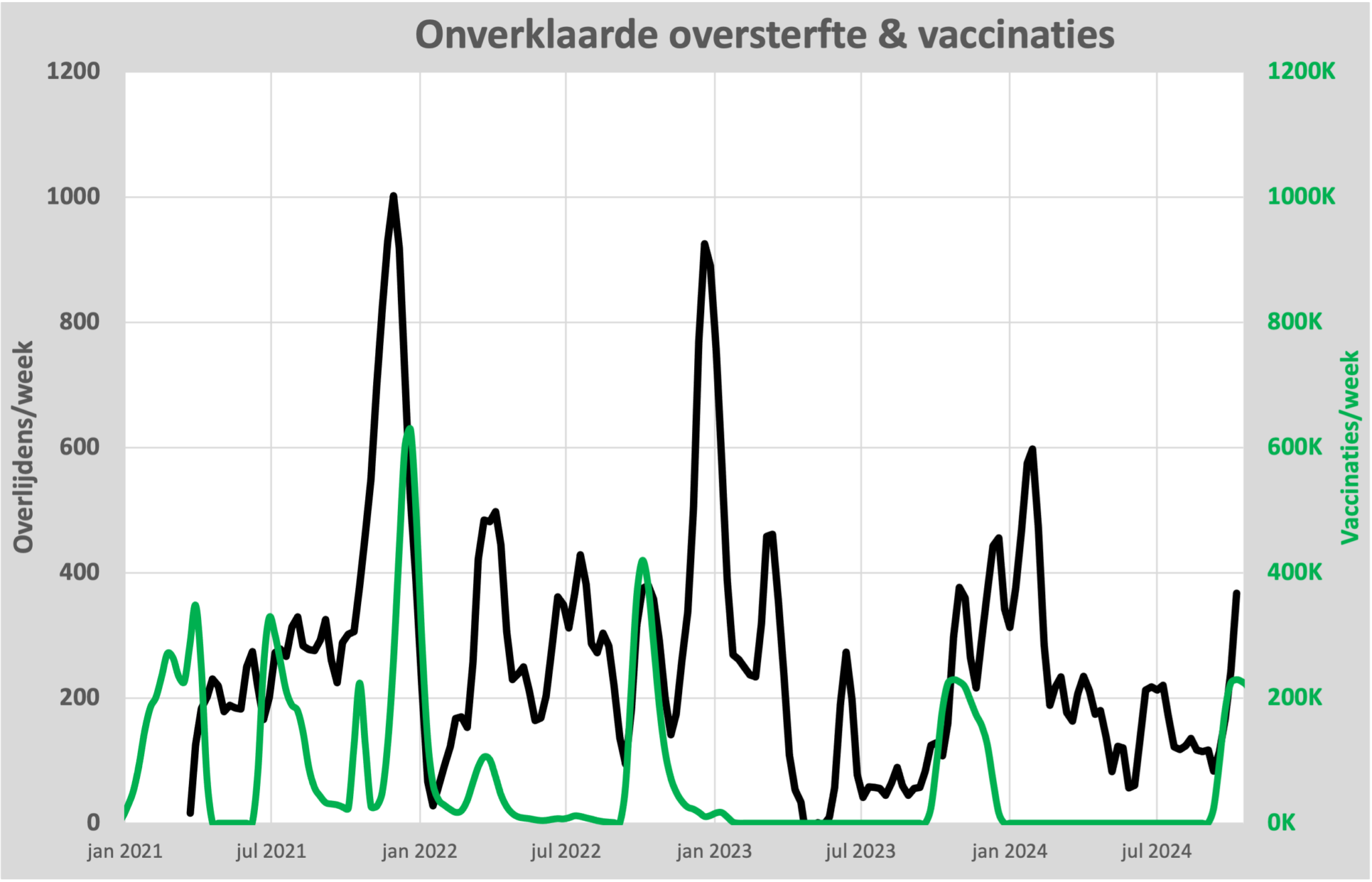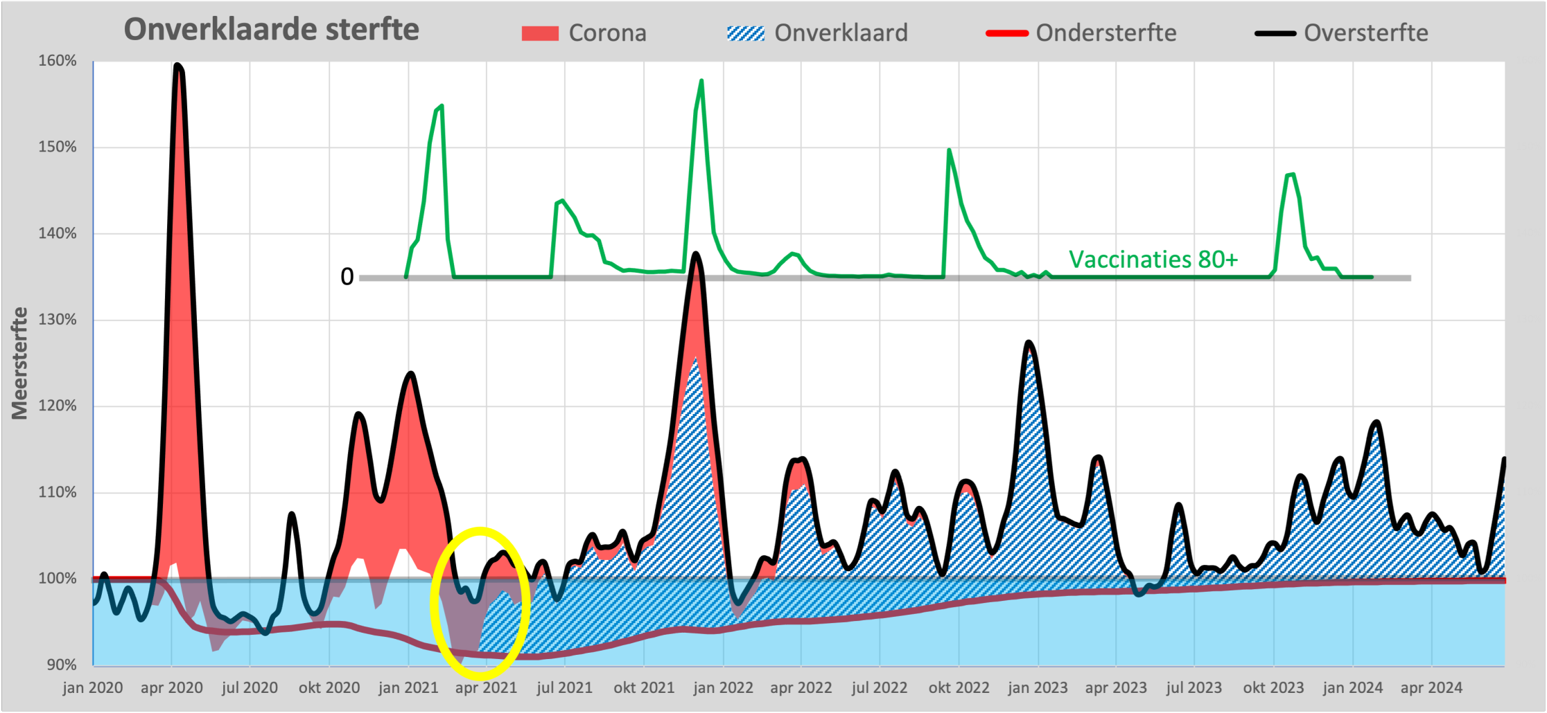 De verdwenen ondersterfte wordt uitgelegd aan de hand van grafieken die de vaccinaties projecteren op het verloop van de oversterfte.Lees meer...